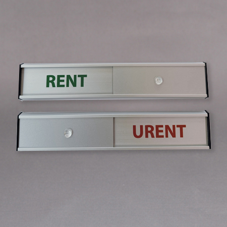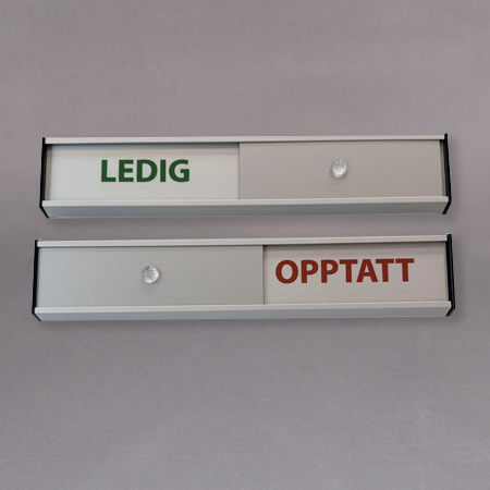 Skyvbare Standardskilt med tekst ledig opptatt. Skilt i aluminium med slider for valg mellom grønn tekst "Ledig" og rød tekst "Opptatt". For merking av møterom og andre lokaler hvor det er behov for å signalisere om rommet er i bruk.